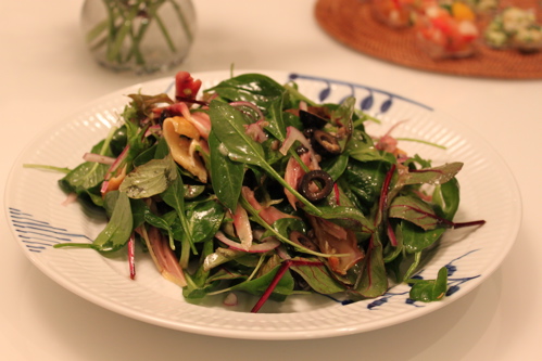 スモークシャモ、ベビーリーフ、黒オリーブ、スライスしたレッドオニオン、アンチョビ、オリーブオイル、塩こしょう、ハーブビネガーをよくまぜあわせて、最後にスライスしたゆで卵をかざりました。(写真を撮り終わってからゆで卵をのせ忘れたことに気づきました)
