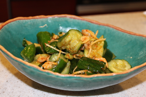 まずはきゅうりの辛みあえです。干しえび、千切りしょうが、たたいてつぶしたきゅうり、豆板醤、ごま油、酢、しょうゆを混ぜ合わせたもの。これはみなさんに好評でした♪
