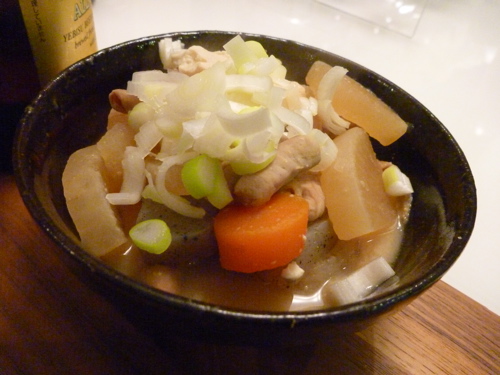 脂肪をとって下ゆでした白モツ、大根、人参、こんにゃくを煮込み、味噌、砂糖、みりんで味付け、最後にお豆腐を入れて煮込みました。盛りつけしたあとに、刻んだねぎと七味唐辛子をかけてできあがり♪(子供がいたので七味唐辛子はテーブル毎にかけてもらいました)冬はこういう煮込みがおいしいですよね〜。