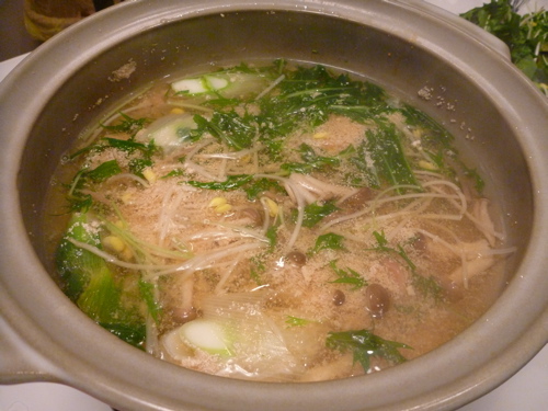 お鍋に鶏がらスープ、明太子、おろしにんにく、酒、水を入れてスープを作り、水菜、ねぎ、もやし、しめじ、しゃぶしゃぶ用豚肉を入れていただきました。