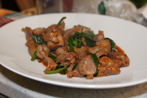 ごま油で砂肝、にんにく、ニラを炒め、塩こしょうとコチュジャンで味付けしました。