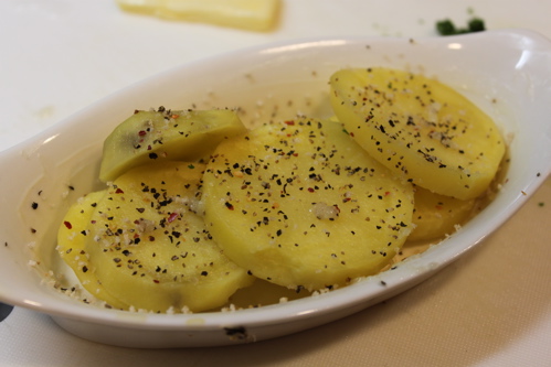 まず、耐熱皿にバターを塗り、チンしてスライスしたポテトを並べ、ハウス香りソルトペパーミックスをふりかけとおろしにんにくを所々にのせます。さらにその上に同じようにポテトを重ね、ペパーミックス、おろしにんにくをのせ、2〜3段にします。