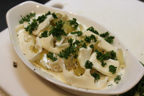 ひたひたになるくらいに生クリームを注ぎ(写真をとった後もう少し足しました)、モッツァレラチーズ、パセリのみじんぎりをのせ、230℃のオーブンで10分間焼いたらできあがり♪