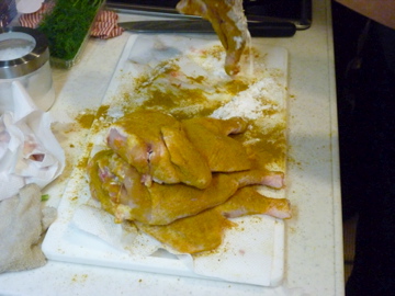 塩、お店のカレー粉と片栗粉をたっぷりつけてしばらく置きます。