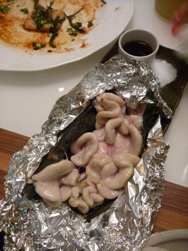 私が作ろうとしていたのは焼き白子。でもプロの目では「これは生で食べなきゃもったいない!」と判断し、2種類になったそうです。私のこの頃にはもう疲れていたので、後は彼らに任せてようやく飲んだり食べたりすることができるようになりました。それにしてもおちょこにポン酢を入れて出すなんて、さすがですよね。2人ともわが家の食器棚と冷蔵庫を見てさささっと作ってくれたんですよ。やっぱりプロは違うな〜って当たり前か(笑)。