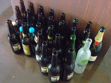 今回空いた瓶。ビールは大びん1ケース(20本)がすべて空き、その他シャンパン2本、日本酒4合びん2本、ラムネ2本、こどもビール1本、ジュース、チューハイなどが空きました。