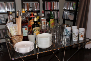 バルコニーのすぐ手前、室内にもガラステーブルを置いて、常温のドリンク(焼酎、洋酒など)、取り皿、箸、おしぼり、グラスなどを用意。これらはすべてセルフサービスでお願いしました。シェイカーなんかも置いておきましたが、やっぱりみんなそのまま飲めるものの方が飲みやすいようで洋酒やリキュールはほとんど飲まれなかったみたいです。