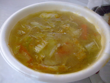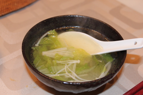 まずは温かいスープで胃を温めます。白菜とえのきの中華スープ。