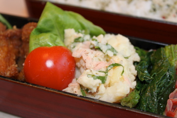 れんこんのきんぴらとポテトグラタンの残り(実はこれ、かなり前のお弁当です)、そして彩りのレタスとミニトマトを詰めたらできあがり♪グラタンだけ洋風ですけど、そこは目をつむってくださいね。