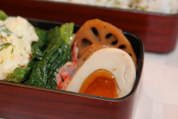 ほうれん草のからし和え、味玉、そしてれんこんのきんぴらを添えて。