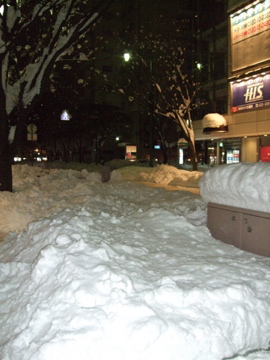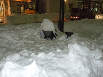 あまりの大雪で、半日雪かきに追われた彼が長靴を買いたいというので、金曜の夜万代シティという繁華街に買い物に行きました。この写真はその万代で撮ったものですが、見てください、置きチャリが完全に雪に埋まっています…。車もスッポリと雪に覆われているものを何台も見ました。雪が溶けるまで車出せませんね。
