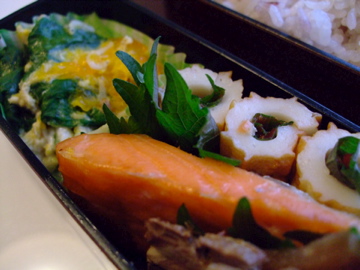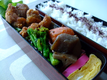 残った筑前煮とかまぼこを入れてみましたが、かまぼこの鮮やかなピンク色ってお弁当の中ではちょっと浮きますね^^;