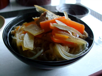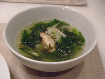 味付けはウェイパーと塩こしょうです。材料はしいたけ、えのき、春菊、ねぎ、くずきり。すき焼きの材料そのものです。