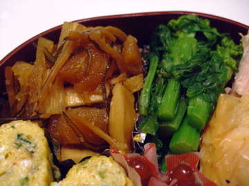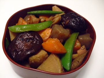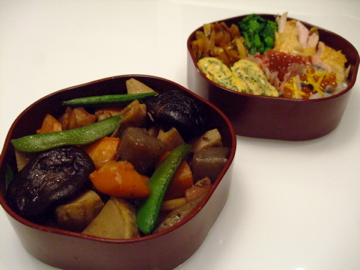 新潟ではお正月にのっぺという郷土料理(煮物)を食べる習慣があって、本来であればのっぺを入れるべきなんだと思いますが、彼がのっぺはあまり好きではないというので筑前煮にしました。入っているのは鶏もも肉、れんこん、ごぼう、ゆでたけのこ、にんじん、こんにゃく、干し椎茸、スナップエンドウです。