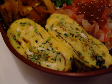伊達巻きのかわりに入れたのは三つ葉入りだし巻き卵。おだしを多めに入れたら形を整えるのが難しかったですが、巻きすを使って整えたらキレイにできあがりました。