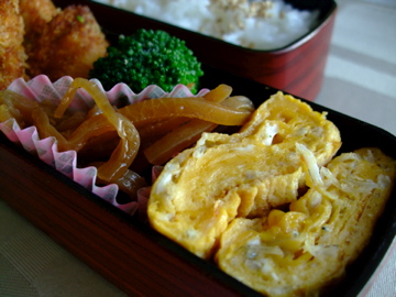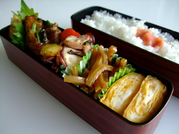 他には彩りに卵焼きと、こっそりミニトマトがはいっています(肉とたこの間)。