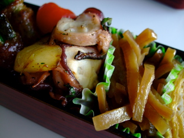 肉巻きは3個ずつ入れたのですが、肉巻き1個に使うお肉は1/2枚。だから使用した豚肉はたった3枚なんです。でも彼は「今日はやけに肉が多いね」と言いました。完全にかさにごまかされています。れんこんのはさみ揚げの日は「肉が少ない」(この日だって挽肉結構使いましたよ)と文句を言っていたところをみると、外側に肉があれば気にならないのかな?(笑)
