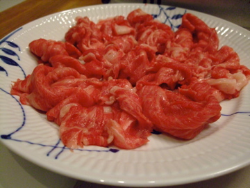 お刺身用の小さめのサクを1本買ってきて、その1/3くらいを薄く切ってお皿に並べました。しゃぶしゃぶだから小さくてもいいんですよね。なるべく大きくなるように斜めに切ってみたけど、元の大きさがあるからこれが精一杯でした。でもこうやってお皿に並べてみるとサマになってますよね。