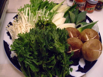 野菜は水菜、えのき、下仁田ねぎ、しいたけ、春菊です。