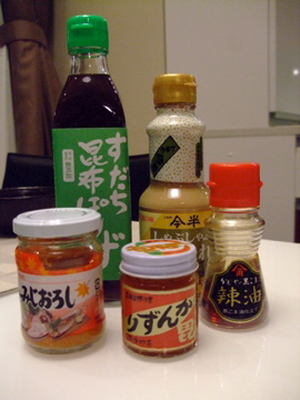 ポン酢用にもみじおろしとかんずり、ゴマだれ用に辣油も用意しましたよ。