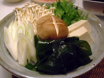 水菜、えのき、ねぎ、しいたけ、お豆腐、そして生わかめです。これ1人分なんです。多いでしょ。でもお野菜でおなかを満たそうと思ったので多めに。結果的には多過ぎましたけど(笑)