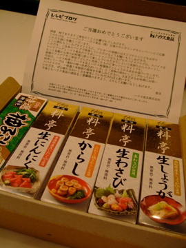 「料亭シリーズ」の生しょうが、生わさび、からし、生にんにく、さらに特選柚子こしょうがそれぞれ2本ずつ入っていました。本当に最近のモニター商品は太っ腹な企画が多いですね〜。これだけあれば相当使えます。