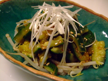 3)器にもやしをしいて、その上に2)のきゅうり、白髪ねぎを飾ってできあがり♪