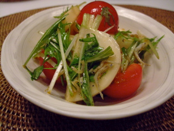 1)かぶは皮を剥いて、ヘタを少しだけのこして16分割する。ミディトマトは半分に、水菜は4cmくらいに切っておく。