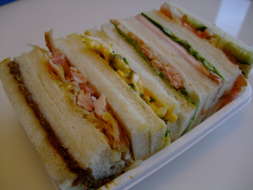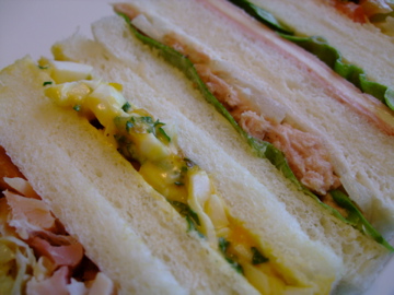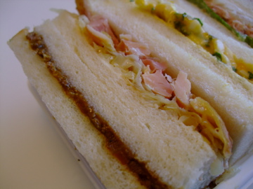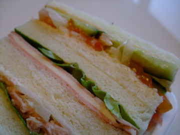 ハムチーズはサラダ菜、ハム、チーズ、ハムの順に重ねて、野菜サンドはうすくスライスしたきゅうりとトマト、たまねぎを並べました。