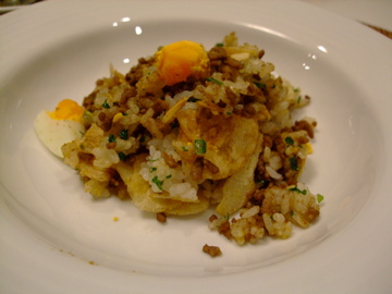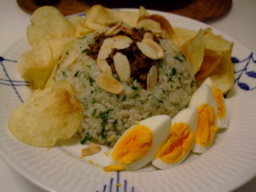 バターライス、ドライカレー、ポテトチップス、アーモンドスライス、ゆで卵の絶妙なコラボレーションが味わえます。食事でもあるけれど、スナックのような軽い感じもします。きっとポテトチップスのせいですね。