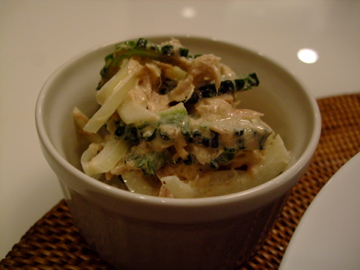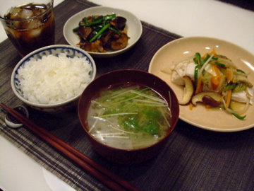 大根と水菜のサラダは梅ドレッシング(梅干しをたたいたもの、サラダ油、ごま、しょうゆ、酢、こしょう)で。きんぴらごぼうに翡翠チンゲンサイ、お味噌汁はほうれん草とえのきを入れました。