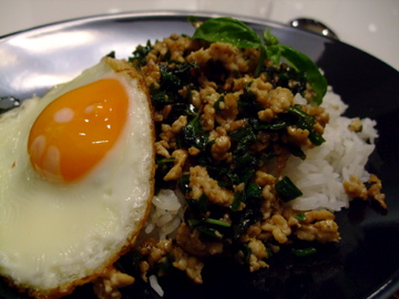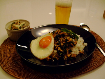 鶏挽肉と細かく切ったピーマンをにんにく、赤唐辛子と一緒に炒め、酒、砂糖、オイスターソース、ナンプラーで味付け、最後にたっぷりのバジルを加えました。タイ米を使って、最後に目玉焼きをのせて。黄身はとろとろにするのがポイントです。