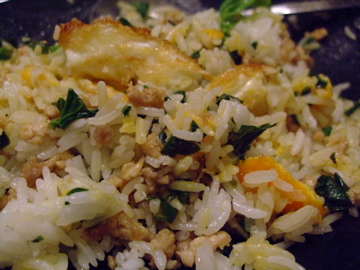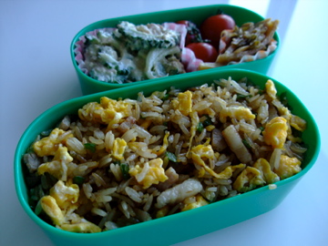 私のお弁当は、残ったタイ米と塩豚で炒飯に。