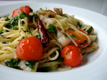 1)オリーブオイルににんにくと赤唐辛子を入れ、香りが出たら細切りにした塩豚を加え炒める。