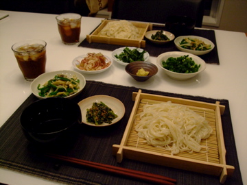しばらく和食を離れ、食卓が欧米化したせいか、体重が増えてしまいました。その数値にびっくりして慌てて食事を和食に戻した第1日目の食卓は、いただきものの稲庭うどんです。薬味はしょうが、みょうが、大葉、ねぎ、写真には写っていませんが海苔も少し切りました。稲庭うどんには絶対にしょうがが合うと思います。