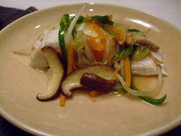 あんかけはピーマン、もやし、にんじん、たまねぎ、椎茸、ねぎ、しょうがを細切りにしてごま油で炒め、ウェイパーで味付けました。お酒をふって蒸し器で蒸したスズキに野菜あんかけをかけたらできあがり♪