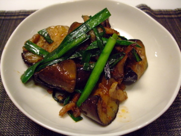 なすは乱切りにして水にさらし、塩豚はこまかく刻み、にんにくは薄切りに、にらはざく切りにしておく。ごま油ににんにくを炒め、塩豚、なすをよく炒める。なすがしんなりするまでよく炒め、豆板醤、オイスターソース、酒、砂糖で味付けし、最後ににらを加えてさっと炒めてできあがり♪