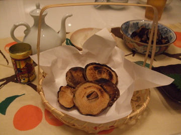 焼き椎茸。焼いた椎茸に大根おろしとお醤油、七味唐辛子をかけていただきます。