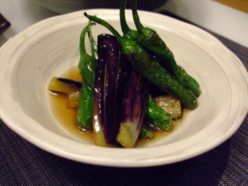 なすとししとうの揚げ浸し。なすは8等分に切って包丁でスジを入れ、ししとうは破裂防止のためにフォークで穴をあけてから揚げました。揚げ浸しになすは欠かせませんね〜。