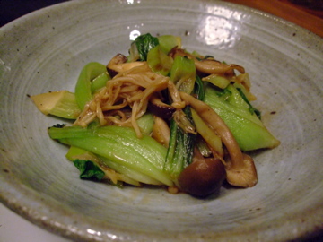 ごま油、にんにく、しょうが、ねぎで青梗菜ときのこ(しめじ、えのき、椎茸)を炒め、塩こしょうとオイスターソースで炒めたものです。