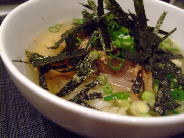 ごはんにごまをふって、漬け、ねぎ、海苔を乗せ、お出汁をかけます。わさび醤油で味をととのえて完成です♪(海苔は彼に切ってもらったのでちょっと大きめですね^^)