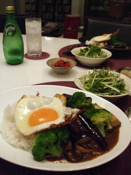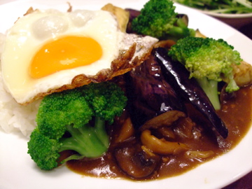 使ったきのこはしめじ、舞茸、エリンギ、ブラウンマッシュルーム。スパイスはこしょう、ナツメグ、ガラムマサラ、ターメリック、カレーパウダー。ブロッコリーはかために塩ゆで、なすは素揚げしてあります。合い挽き肉ときのこをたっぷり使った秋のカレー、きのこの旨味がカレーをおいしくしてくれます。