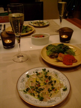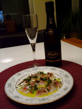 前にいただいたスズキを食べきらないうちに、第2弾がやってきました。ど、ど、どうしよう…。と考える間もなく食べざるを得ないので、今回はそのままお刺身ではなく、カルパッチョにしていただくことにしました。せっかくなのでスパークリングワインもあけて。