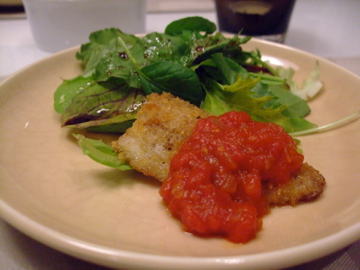 クレイジーソルトとこしょうで下味をつけたものを多めのオリーブオイルで焼いて、最後にトマトソースをかけました。付け合わせはベビーリーフ、バルサミコドレッシング(オリーブオイル、バルサミコ酢、塩こしょう、はちみつ)で。
