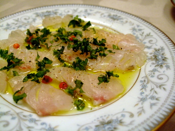 カルパッチョは先日の鰺のカルパッチョと同じレシピです。鰺からスズキになっただけ。違いは写真を撮った後にかいわれ大根をちらしたくらいかな。