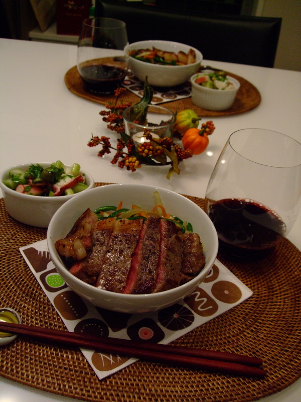 丼にごはんを盛って、そこにお肉のフライパンに残ったたれをかけて、ソテーしたお野菜とステーキをのせたらできあがり♪
