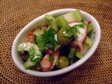蒸しだこ(ゆでだこでも可)をすじをとったセロリは同じ大きさにぶつ切りにしておき、オリーブオイル、たこ、セロリ(葉も使います)、オリーブ、おろしにんにく、塩こしょう、ハーブビネガー(レモン汁でもワインビネガーでも可)をボウルにいれてよく和え、少し時間をおいたらできあがり♪