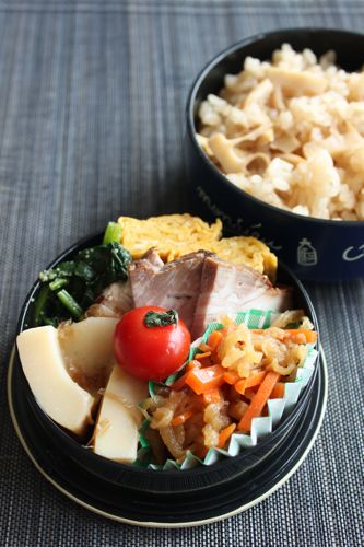 あとは切り干し大根の煮物、たけのこの土佐煮、ほうれん草のごま和え、卵焼き、ミニトマトをそれぞれ少しずつ彩りを考えながら詰めただけなんです。ごはんは前日のたけのこごはんなのでその分少し豪華な感じがするでしょうか。