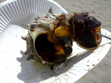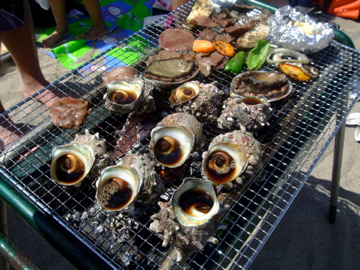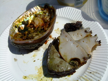 焼きたて半生のアワビにキモをつけて海でいただく…うぅっ幸せですぅ。