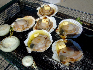 容赦なく火の上へのせ、サザエにはお醤油を、アワビにはバターとお醤油をたらしました。
